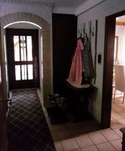 Durch den Eingangsbereich, seitlich am Gebäude, gelangt man in den Flur des Hauses. Von hier aus kann man alle Räume des Erdgeschosses, sowie die Treppe zum Obergeschoss erreichen.