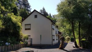 Das im Jahr 1957 erbaute Einfamilienhaus, welches im Jahr 1974 durch einen großzügigen Anbau erweitert wurde, steht in einer ruhigen, abgelegenen Ortslage von Kirn. Das Wohnhaus bietet mit einer Wohnfläche von ca. 155 m², verteilt auf zwei Etagen, genügend Platz für eine Familie mit Kindern. Auf dem 6206 m² großen, teilweise parkähnlichen Gelände sind mehrere Sitzmöglichkeiten, Stellplätze für Fahrzeuge, eine Garage und sogar ein eigener Wald vorhanden.